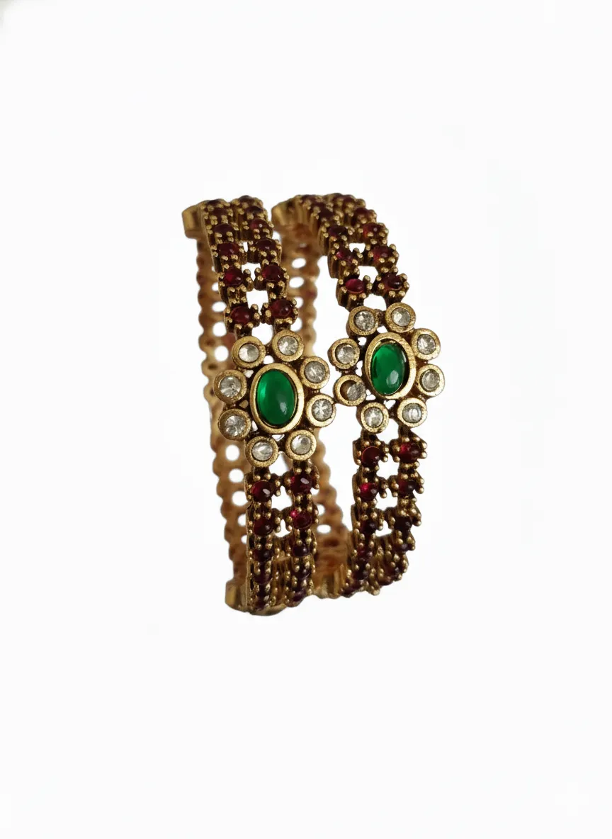Floral Stone Antique Bangles – Gold Toned with Ruby & White Stones (Pair)