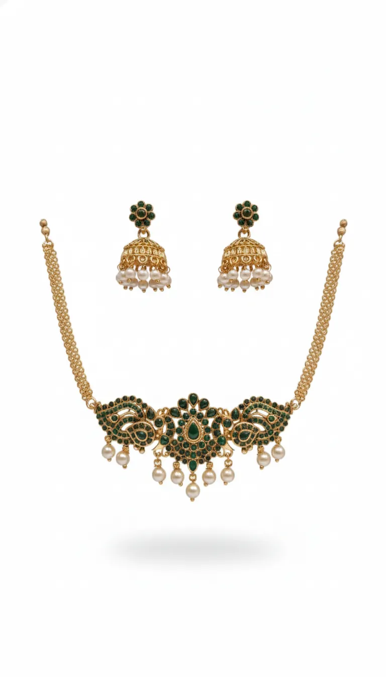 Green & Faux Pearl Choker with Earrings – With Back Chain