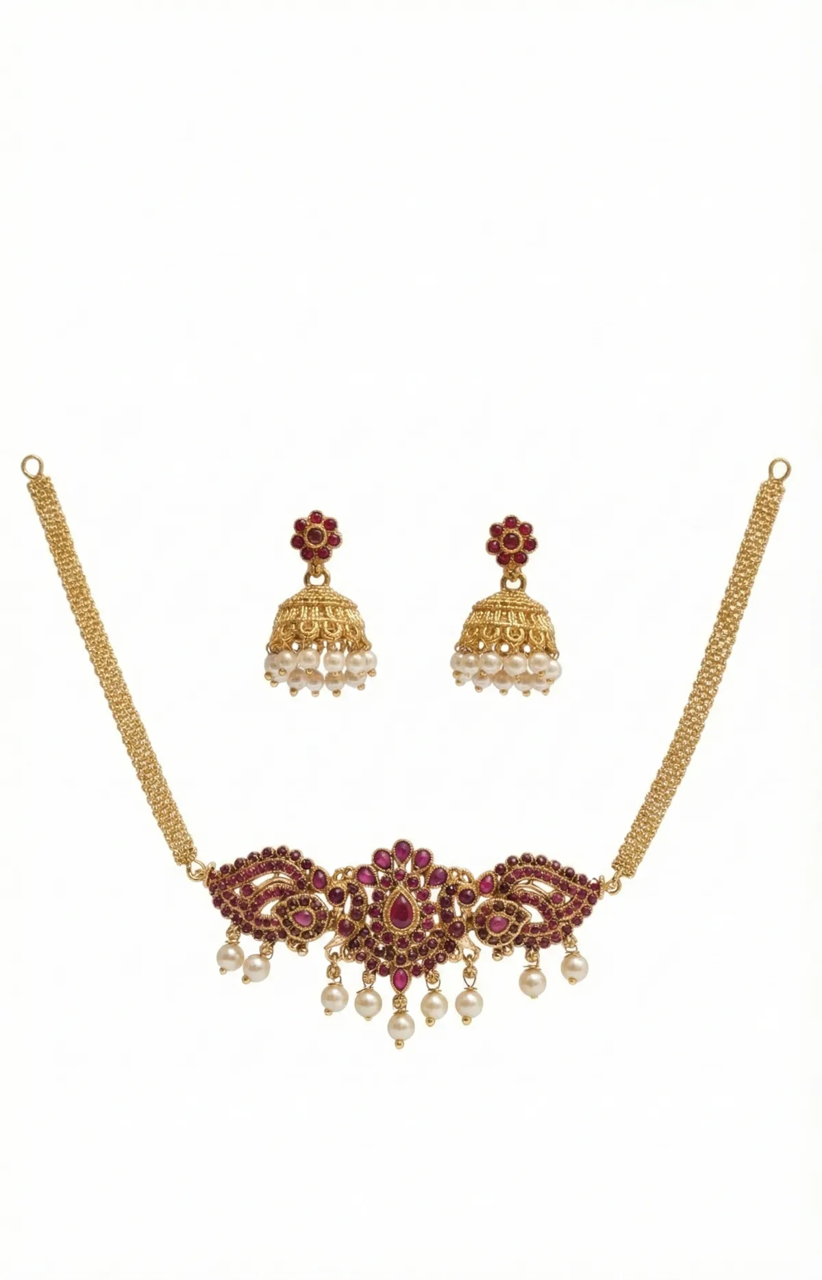 Ruby & Faux Pearl Choker with Earrings – With Back Chain