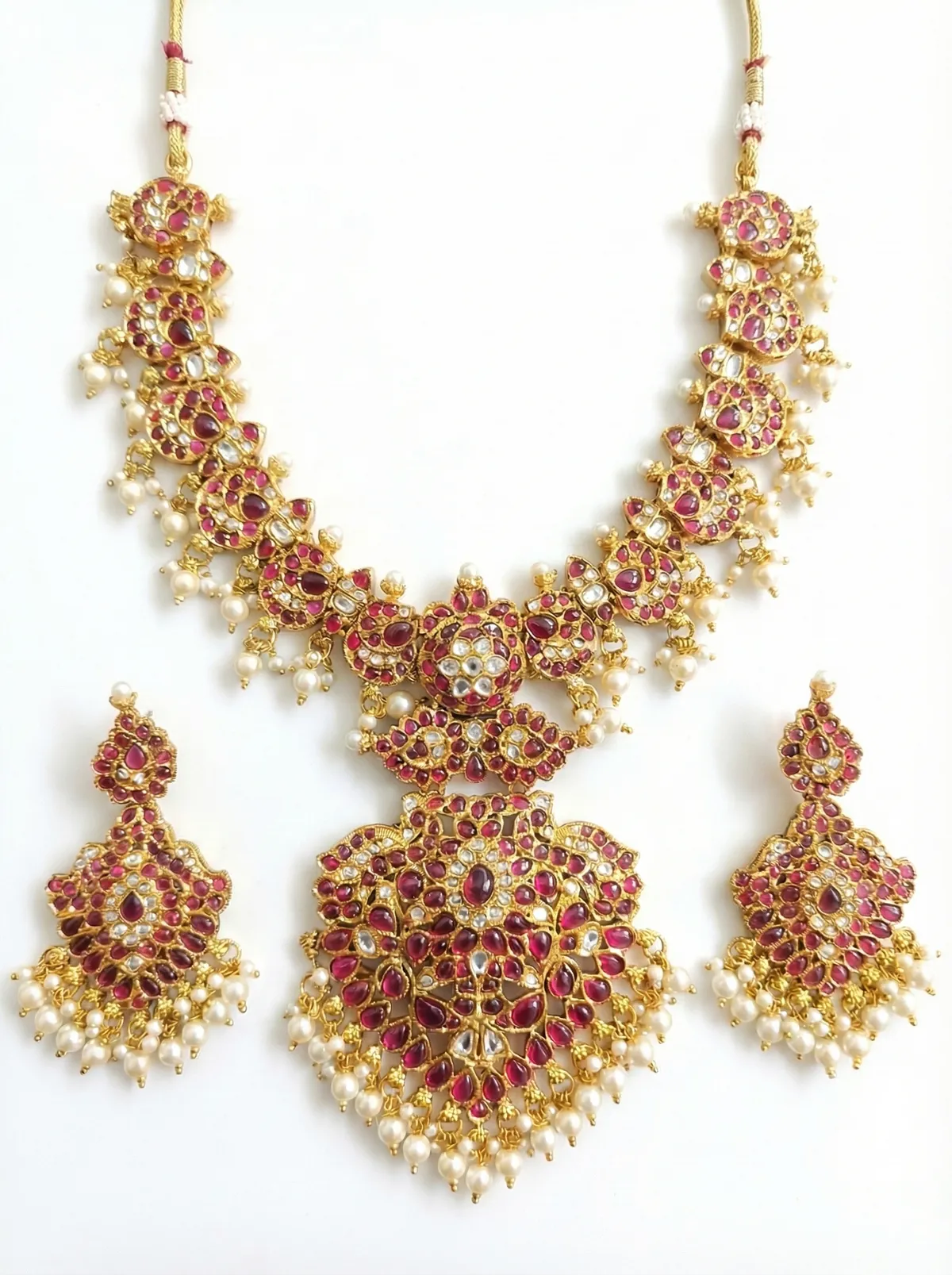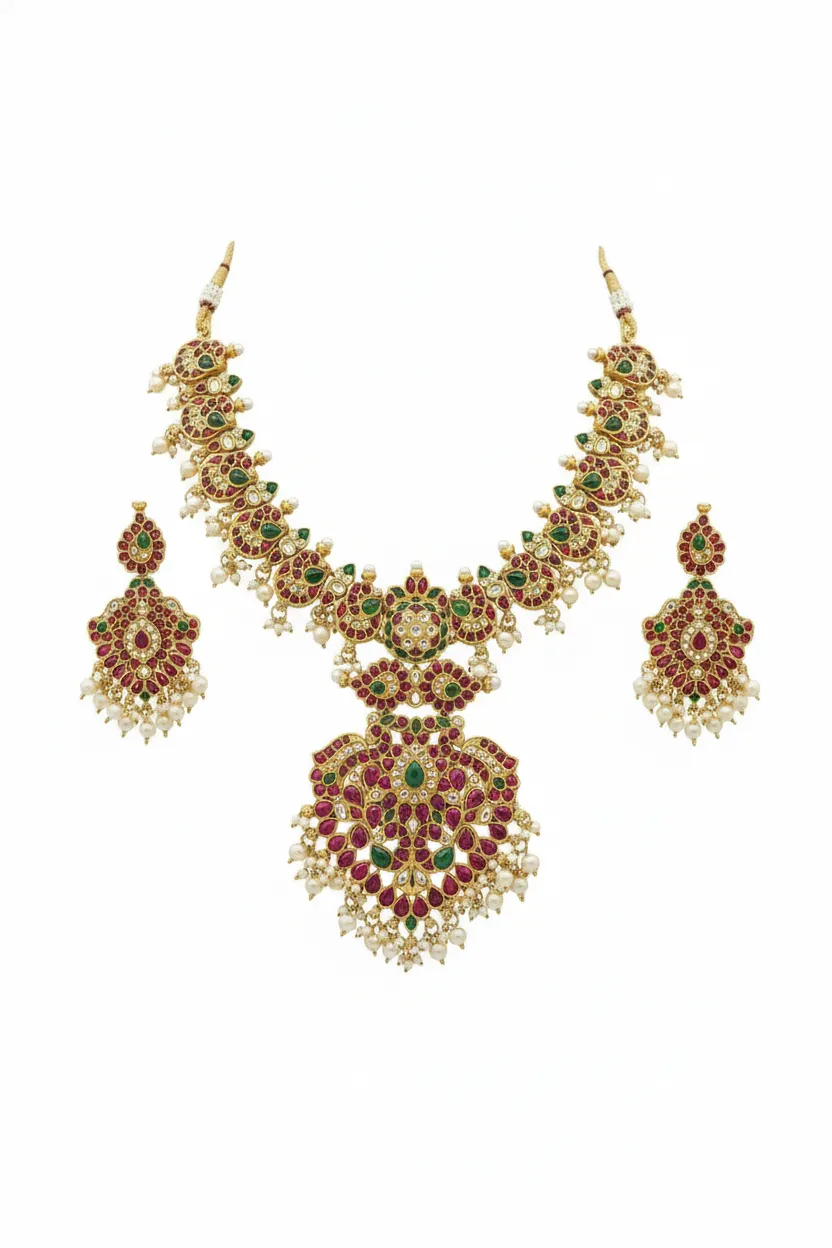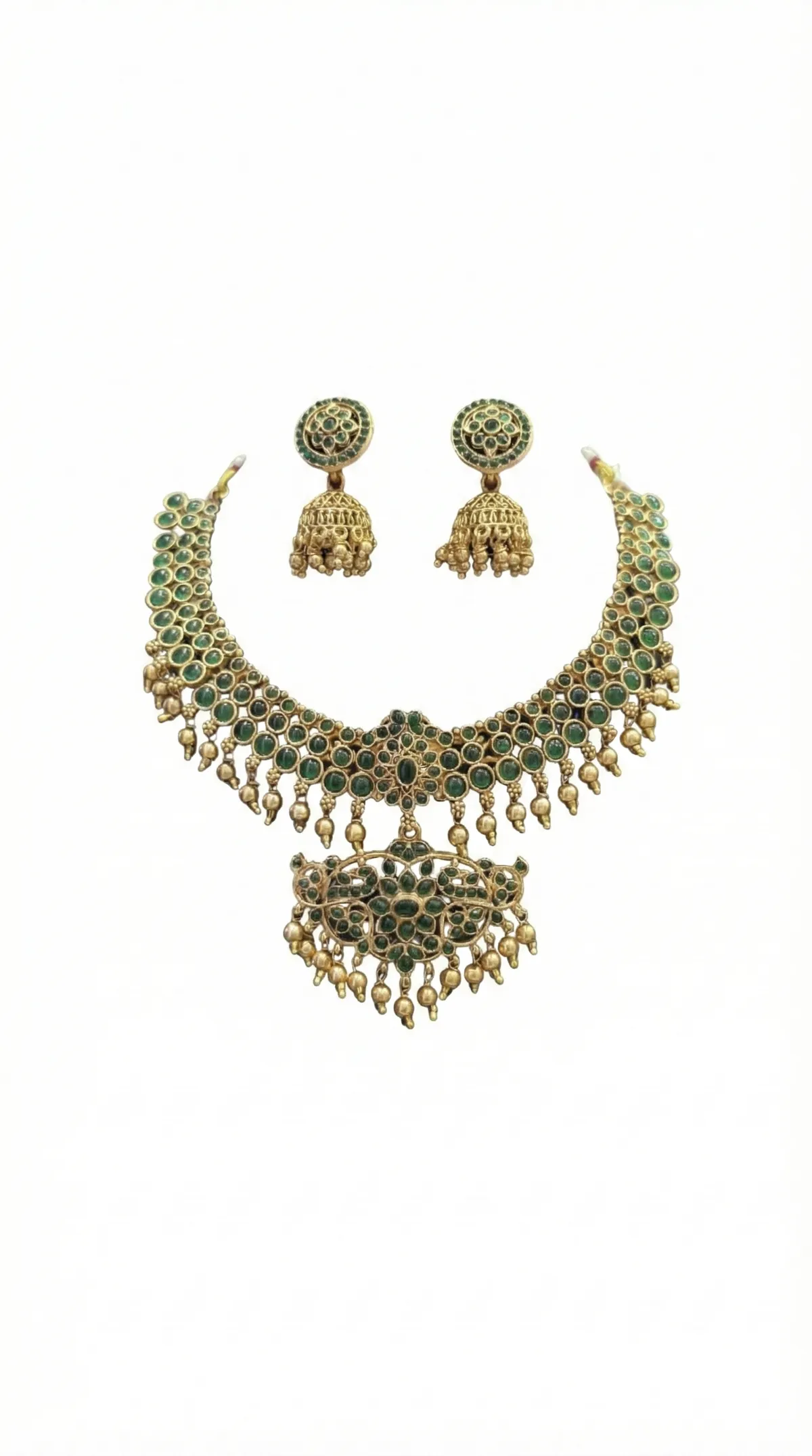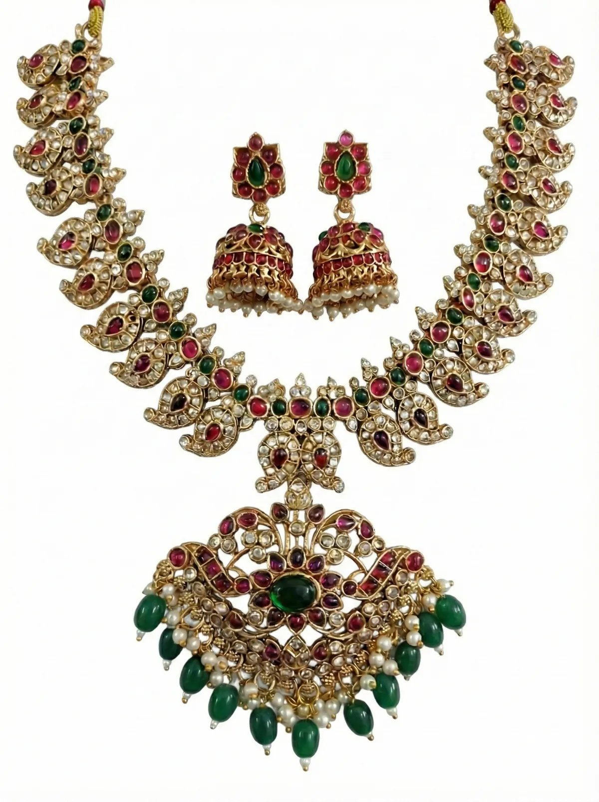 • Grand centerpiece pendant and matching jhumka earrings, ideal for bridal wear, festivals, and classical dance performances