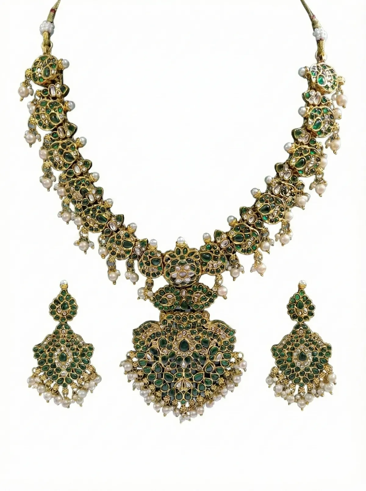 Green Kemp Attigai Necklace with matching Earrings – Bharathanatyam jewellery