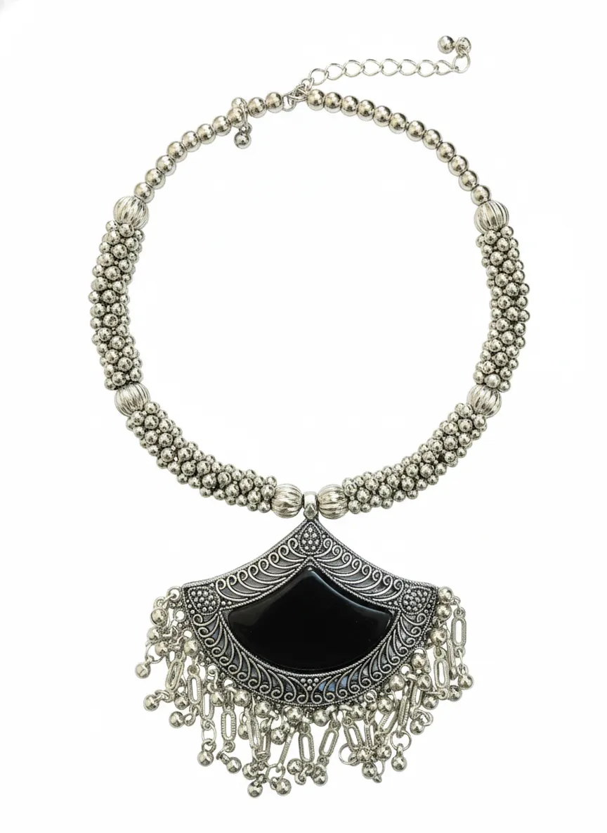 Vintage Silver Toned Beaded Choker Necklace with Black Pendant & Fringe Design